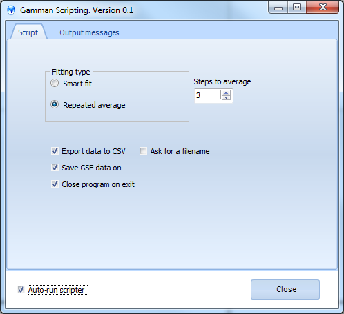 The ´Scripter´ wizard can be accessed at Tools | Scripter This tool has been written to speed up or automate 'standard' Gamman analysis and processing. Only basic functionality has been included, any (airborne or other) corrections or checks cannot be performed using Scripter. Scripter facilitates two processing options, 'smart fit' and 'repeated average'. More information on the processing options can be found at Fitting schemes. Export, save project and close program options can be chosen. Data will be stored in de input data root. When the 'Ask for a filename' box is not checked the default filename is the filename of the first input file. Scripter can handle all possible input file types and performs a stabilization of the data first. When the box 'Auto-run scripter' is checked, Scripter will auto-run the above checked procedures after loading new input data. When checking Show Scripter warning in the Edit | Program settings window, a warning will pop-up at data import, reminding you that the Auto-run functionality of Scripter is enabled.