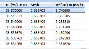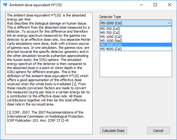 Here, the type of detector can be chosen, which holds the detector specific factor. After pressing “Calculate Dose”, the dose rate for every datapoint will be calculated and this will be added to the data as a separate column as “H*(10) in pSv/s.