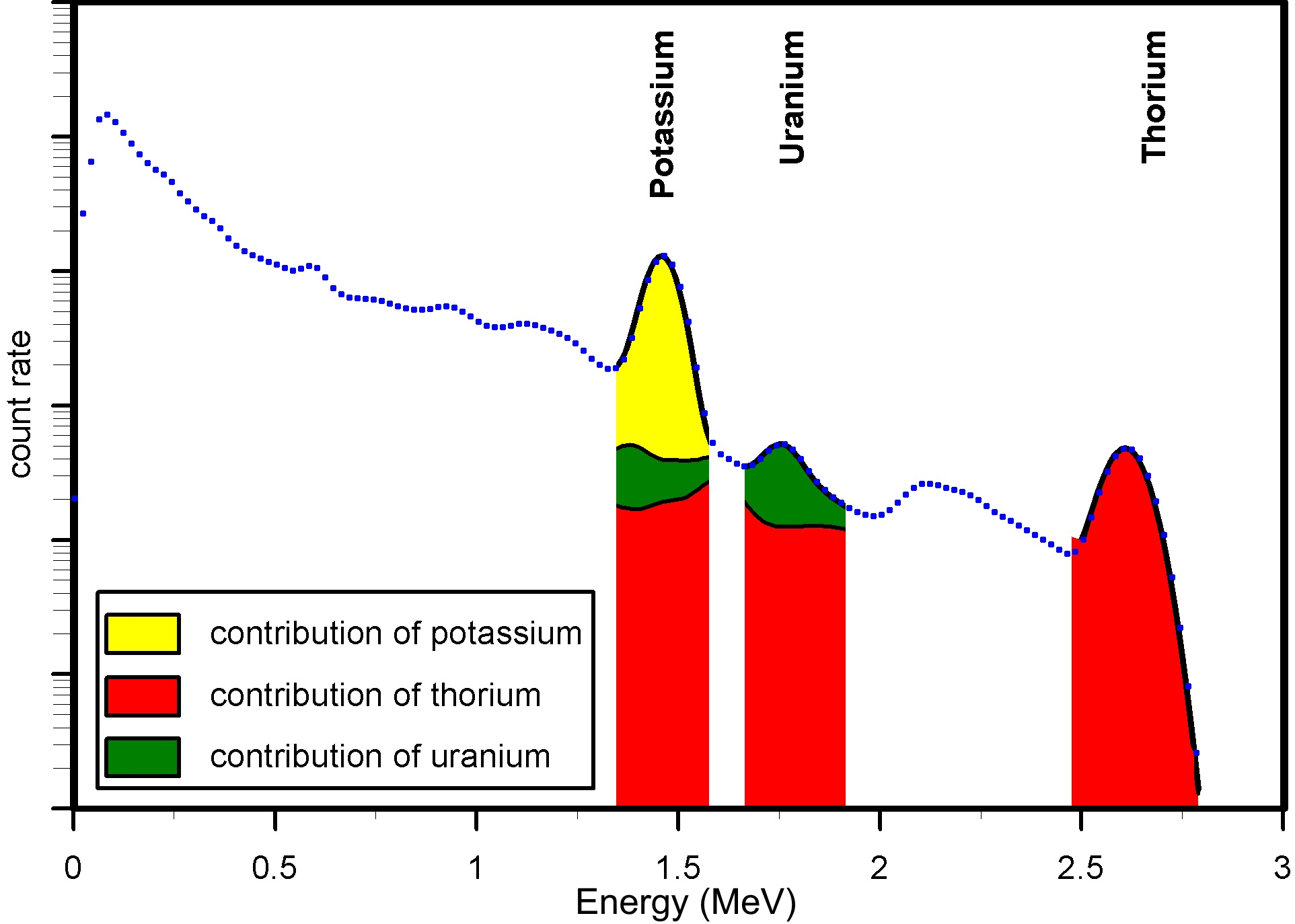 Figure 2: FSA analysis of a natural gamma spectrum. The measured spectrum (blue dots) is approximated by a fitted curve (black line). This curve is composed of the complete spectral contribution of 40K (yellow), 232Th (red) and 238U (green).