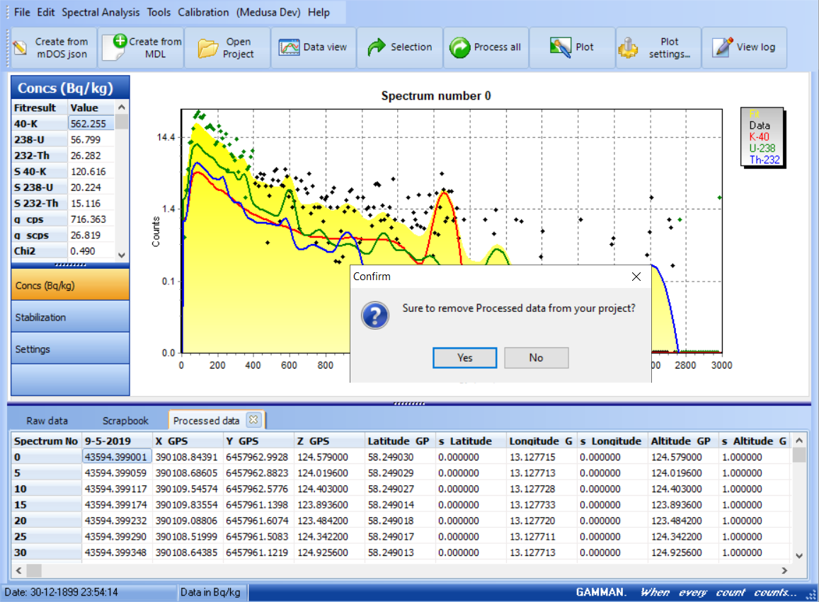 Processing data will calculate the nuclide concentrations, this calculation is based on the fitted curve as discussed in the chapter on stabilization. The processing data menu provides several 'fitting schemes' which can be applied to the raw spectra. The fitting schemes improve the fit results by using variance reduction or averaging the raw dataset. After processing the data, the results can be exported to a CSV file.