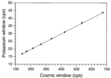 The total background seen by a detector at high enough elevation therefore is the sum of the cosmic component scaled by the count rate in the cosmic channel and the carrier component: BG = BG_carrier + BG_cosmic * TC_cosmic; Now, by plotting for each channel the relation N_channel versus N_cosmics, one obtains a straight line (see for example the figure below, taken from Minty et al, 1997):