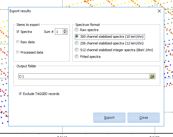 A csv file including the processed data can be made by clicking the tab "file" and then "export results..." and can be used in other analysing programs. The menu seen in figure 4 will appear and here you can select the type of spectra you need. The csv file can include the energy stabilized spectra (distributed over a chosen amount of channels,) raw spectra and the processed spectra.