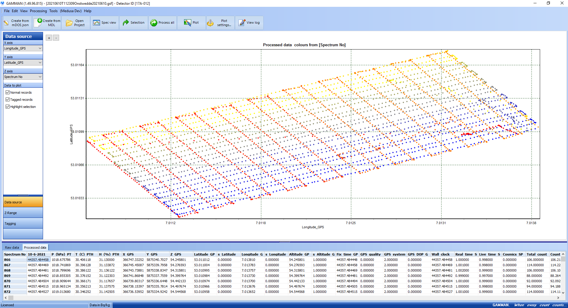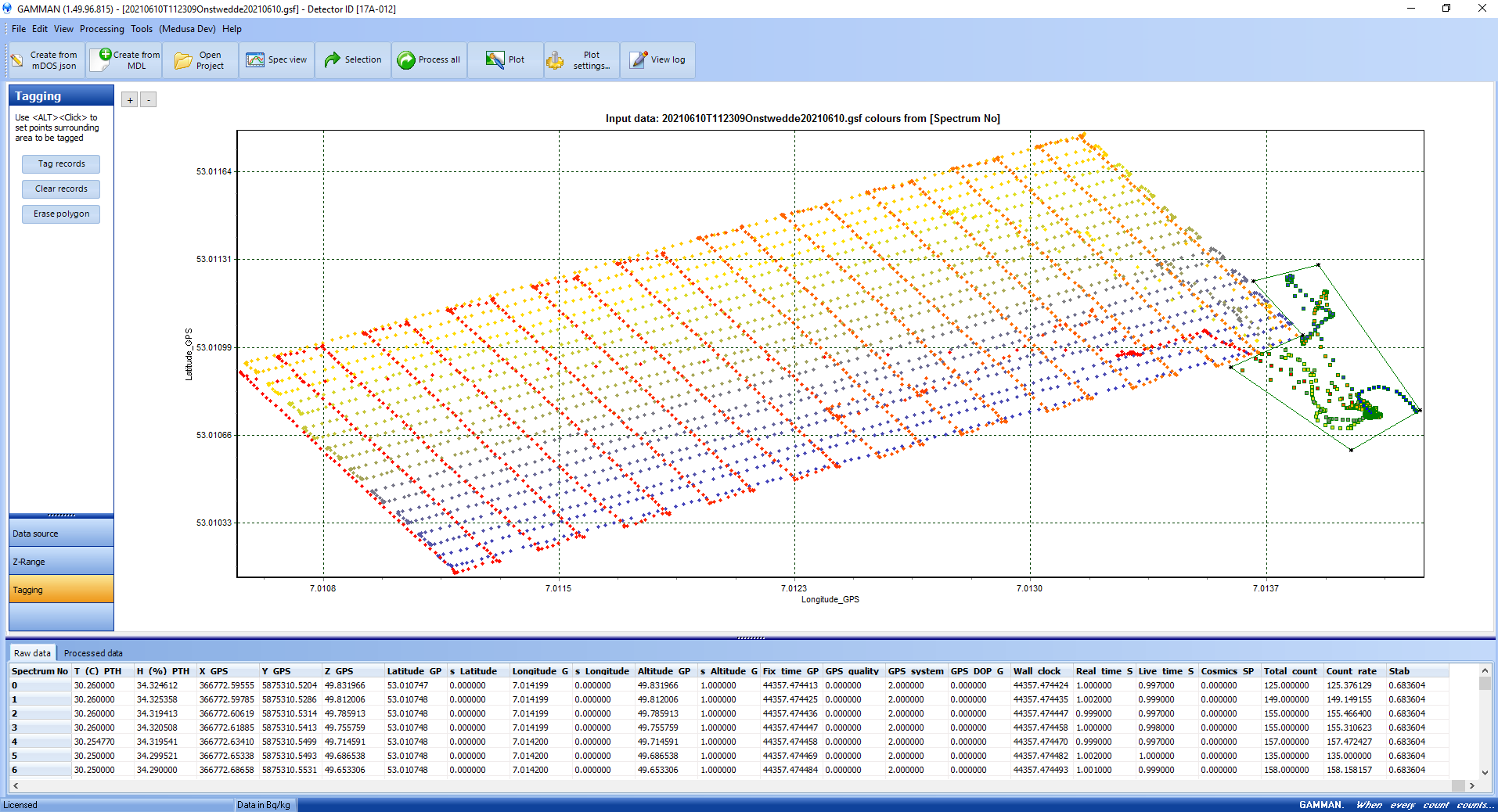 In this dataset, an equally spaced grid is flown over a field. To analyse the correct data, unwanted data (like data measured at the beginning and end points) have to be omitted. This can easily be done using Gamman. After opening the Gamman data, we can switch to "data view" to plot the data using various parameters. In this example, the easiest way to select the correct data is to plot the GPS longitude on the x-axis and GPS latitude on the y-axis. The grid that is flown during the survey can now clearly be seen (figure 1.) The data that may be unwanted are the data points at the far right of the grid: the start and end of the survey. To omit these points, a polygon can be drawn around those points by clicking on the plot while holding the Alt-button on the keyboard. The points selected within the polygon can be taggen by clicking the "Tag records" button (all tagged records within a polygon can also be deselected by clicking "Clear records.")