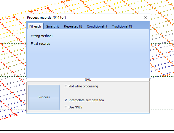 After selecting the raw data that you want to analyse, this data needs to be processed. This will calculate nuclide concentrations based on a certain fitting scheme. Clicking "Process all" will let you process all untagged data. The window shown in figure 2 will appear. Five different fitting schemes can be chosen (these are explained in the Gamman manual.) Here, "Fit each" is chosen and after processing, the results will appear under the tab "Processed data." Plotting this processed data will show that the tagged records are not included (see figure 3.)