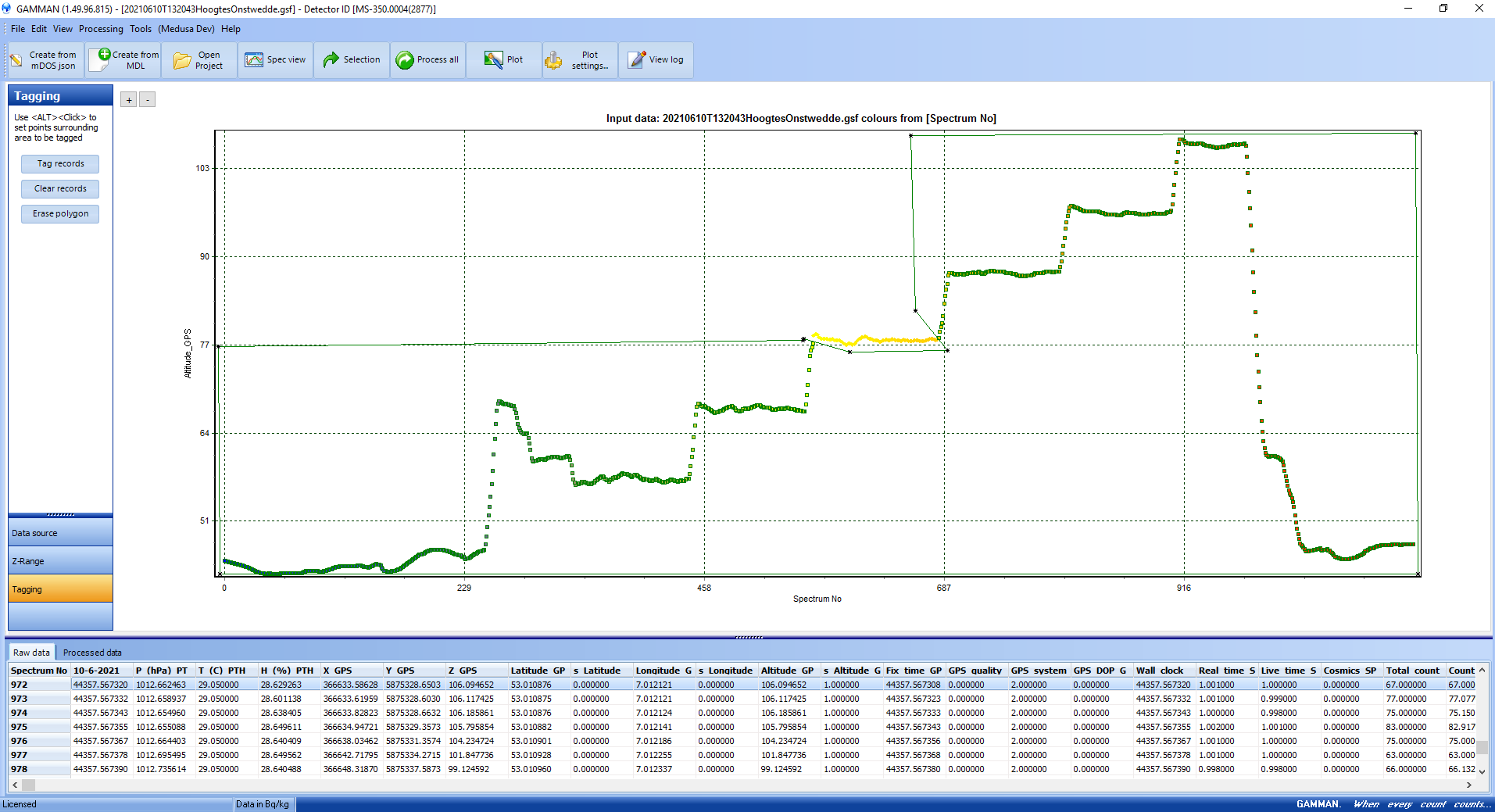 In the second part of this survey, the drone has flown at different heights above a fixed point on the ground. Plotting the GPS altitude against the time, we see that the drone has flown for one to two minutes at certain heights (figure 5.) These heights can be investigated individually by drawing a polygon around the data points received at a certain height and tagging the rest of the data points. In figure 5, this is done for an altitude of approximately 77m. This data can also be processed by clicking "process all" and exported. In this way, data for different heights can be processed separately and be more easily compared to each other. Another way to do this is to click on one data point, hold "shift" on the keyboard and click another data point. All data points which are chronologically between these two points will be selected and these can be processed by clicking the "selection" button. In the survey summary table, some of these height-files are included.