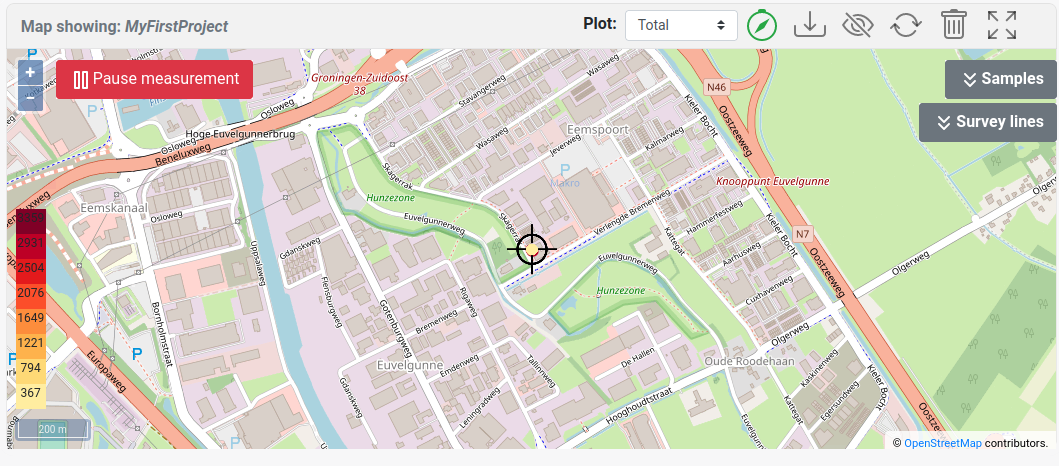 | Pause the meausurement. Note that the detector will continue with collecting data, however data points are not plotted in the web viewer and these datapoints have been marked as 'paused' points. As a result, data collected when the device was in a pause mode can be retrieved from the project |
