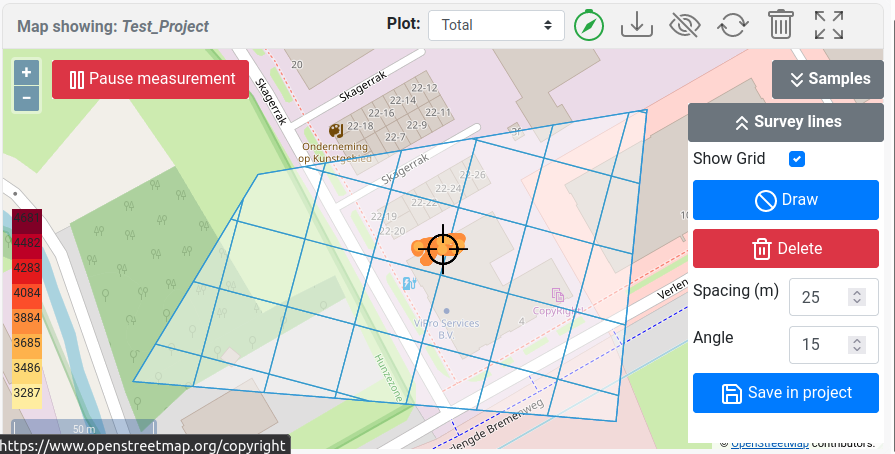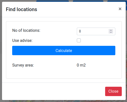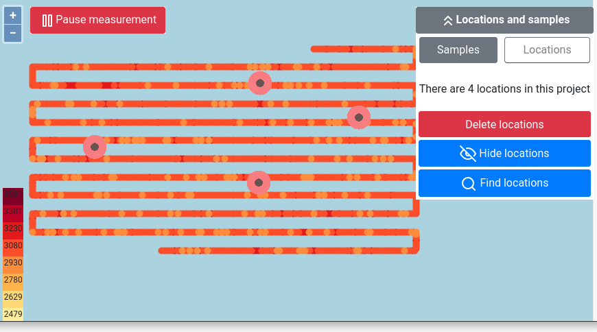 In a project, it might be desirable to take samples, either by doing a long measurement or by taking physical samples and sending these to a laboratory for analysis. The samples should be a good reflection of the variation in the area. The locations tool is used to calculate the best position for taking samples. This location suggestion takes the variation and size of the measured project into account.