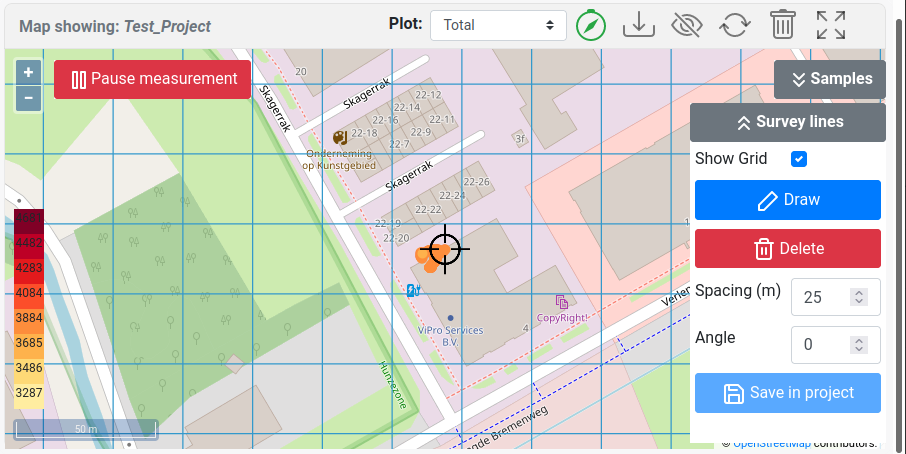 Enable/disable survey lines that can be used as reference points when doing a survey. The line spacing and angle of the survey lines can be specified.