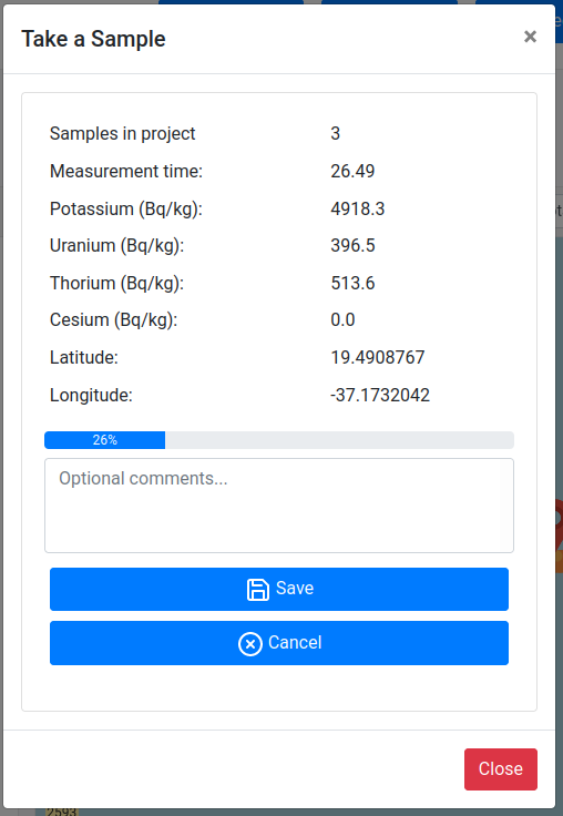 | The sample taking pop-up. Note The sample taking window can be closed while a sample is being taken. In the case when a sample is being taken, this pop-up will automatically be opened when navigating to the dashboard or project page. |