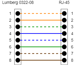 Both connectors share the same pin-out. That is, pin 1 of the Lumberg connector is connected to pin 1 of the RJ45 connector, etcetera. Note that pin 4 and pin 5 have the same function, but they are not connected. The same applies for pin 7 and 8.