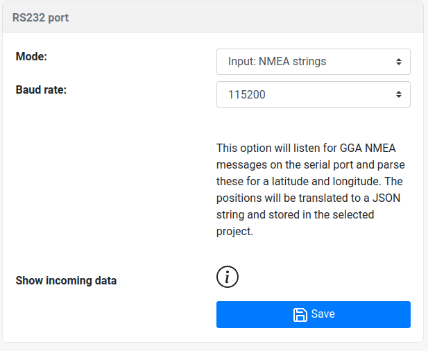 The data page is used to configure outgoing and incoming data. Using this page it is possible to configure a data stream going to an external logging device. Data can be send over ethernet (UDP), or by using the RS232 protocol.