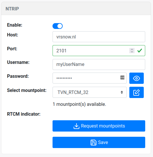 | Select mountpoint | The mountpoint used for the RTK corrections. A list can be retrieved by selecting a correct host and port and then using the request mountpoints button. | |