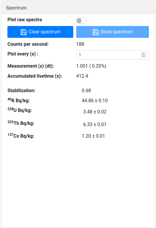 The live spectrum is shown to check the spectral shape, energy stabilisation and the derived radionuclide concentrations (40K, 238U, 232Th and optionally 137Cs). When this page is opened, the incoming and accumulated spectra are shown in the figure. The accumulated spectrum (blue dots) is fitted using the calibration curves (the coloured lines extracted from the calibration file), yielding (a) the blue "fitted spectrum" and (b) the concentrations of K, U, Th, and Cs listed in the Spectrum block. The principles of the fitting procedure can be found in the Gamman Software manual. More info on translating the measured spectrum to an energy scale and the procedure of extracting the nuclide concentrations using standard spectra can be found by clicking on the respective links.