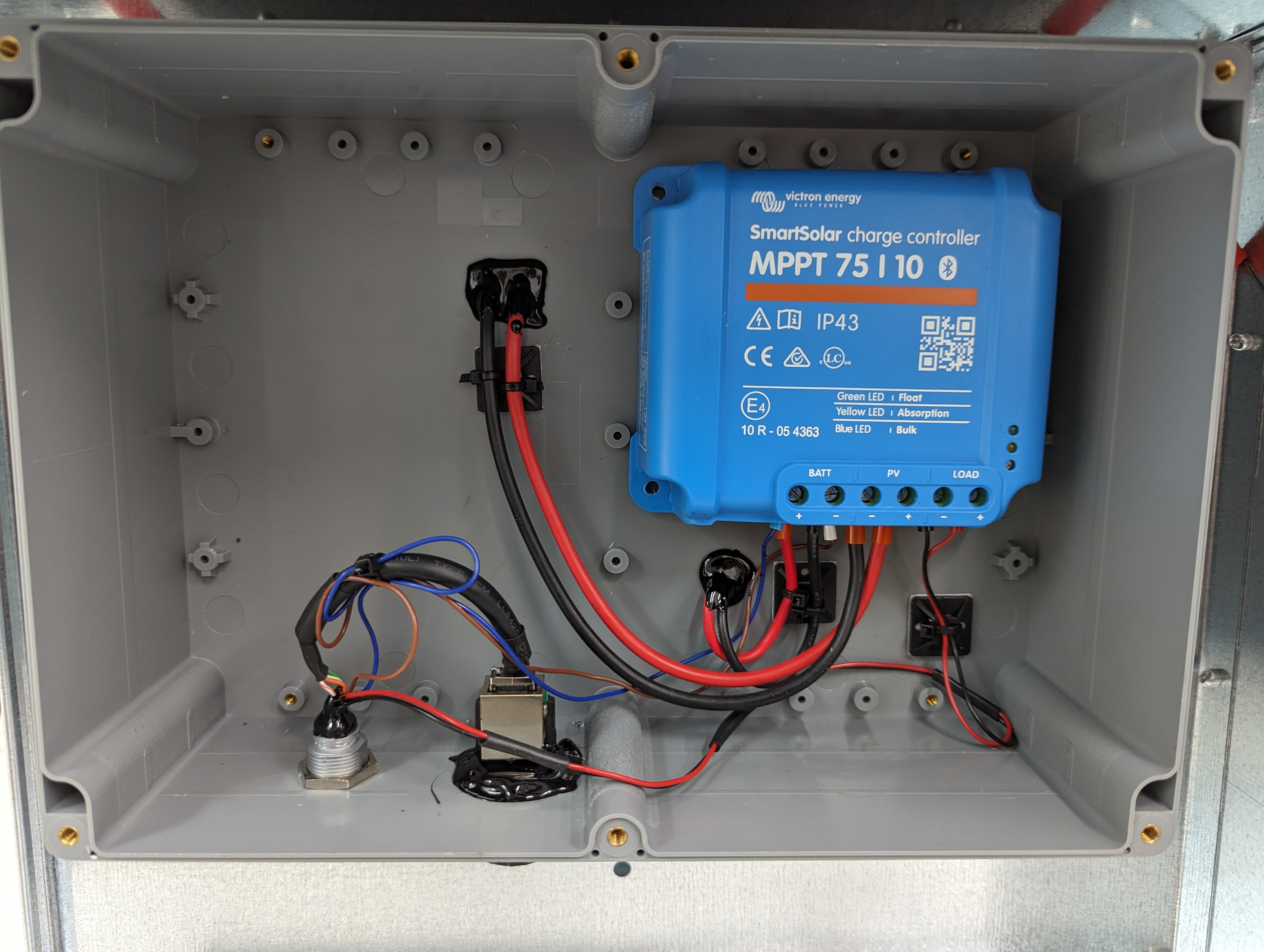 In Figure-3, you can see the inside of the metal cabinet where the battery will be placed and the waterproof gray box where the solar panel controller will be placed. Figure-4 shows the placement of the panel controller (blue box) on the waterproof box and the connections.